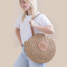 Este bolso redondo de rafia, disponible en color camel y negro, es la elección ideal para tener todo a mano sin renunciar al estilo. Su diseño compacto se eleva con el detalle del logo cosido en forma circular, que le da un toque distintivo y original. Un básico renovado perfecto para acompañarte en tus planes de verano.