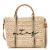 Bolso tipo capazo para mujer de la marca Mustang, modelo Artola, con diseño trenzado artesanal y material vegetal. Este modelo combina asas cortas tipo cuero con una cinta larga removible en beige para mayor comodidad. Destaca el detalle bordado del logo en contraste, aportando un toque moderno. Su interior amplio y práctico incluye compartimentos ideales para organizar tus objetos personales. Perfecto para acompañarte en tus días de verano, aportando estilo y funcionalidad.