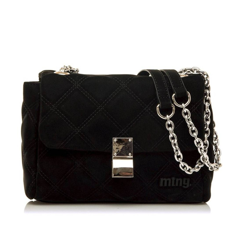 Bolso tipo bandolera negro para mujer de la marca mtng, modelo June. Diseño acolchado con pespuntes en forma de rombo, solapa frontal con cierre metálico y logo negro. Incorpora una doble cadena metálica con refuerzo para mayor comodidad al hombro. I