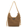 Bolso hobo de mujer, modelo Macy Mtng de color cuero, confeccionado en rafia de papel con un diseño sencillo y natural. Su asa trenzada en macramé con detalles de flecos aporta un toque artesanal y desenfadado. De tamaño práctico y cómodo, es perfect