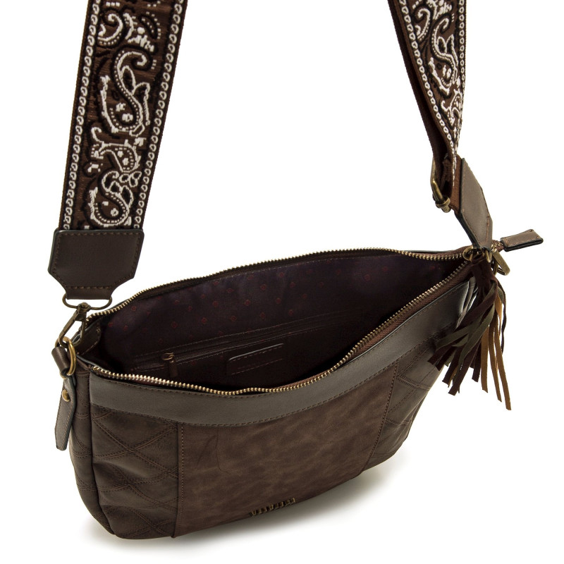 Bolso hobo de color moka para mujer de la marca MTNG, modelo Salter. Su diseño combina una silueta redondeada con paneles laterales acolchados en rombos que aportan textura. Incluye una bandolera ancha con estampado paisley en tonos blancos y marrone