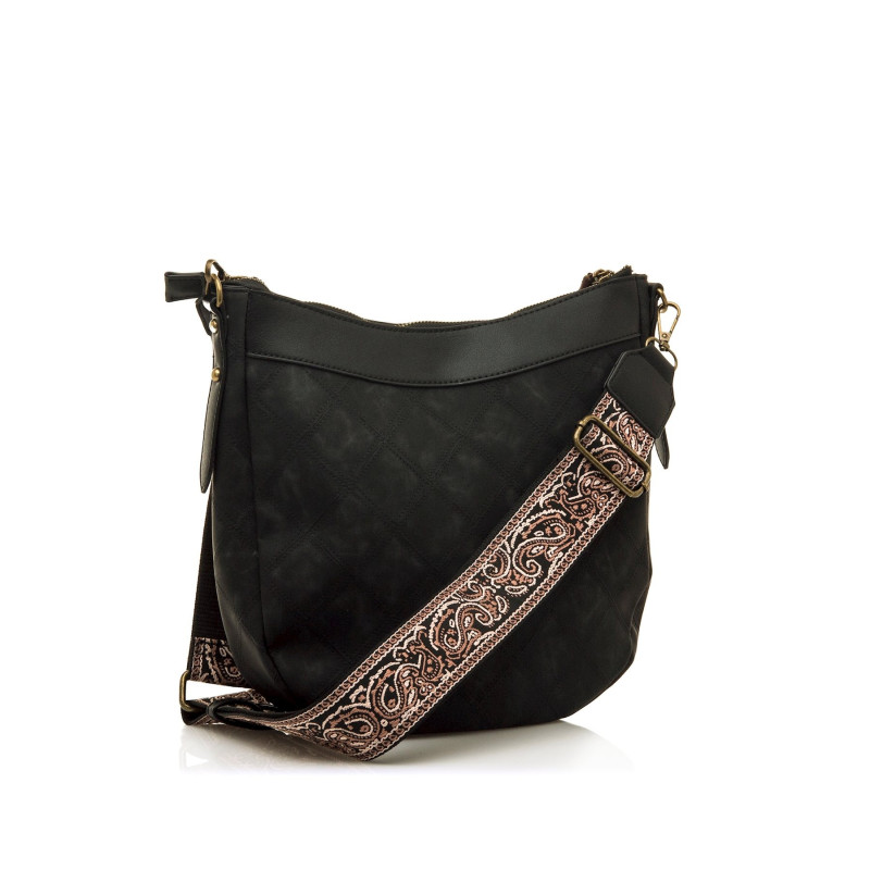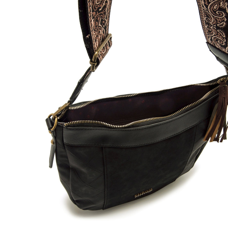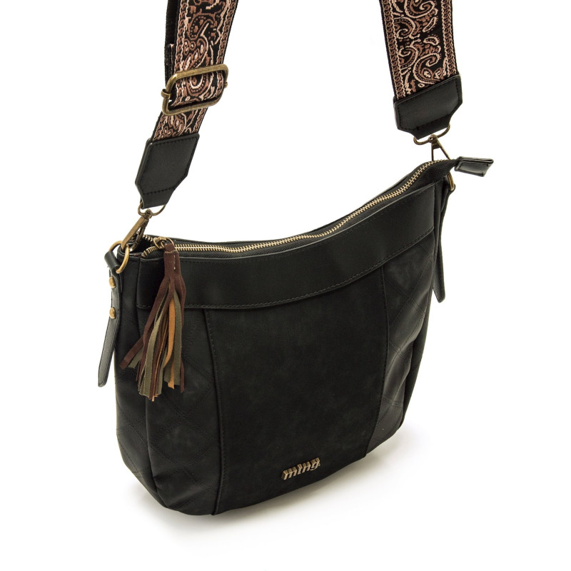 Bolso de color negro para mujer de la marca MTNG, modelo Salter tipo hobo. Su diseño combina una forma redondeada con paneles laterales en patrón de rombos y detalles decorativos en el tirados con flecos en tono verde, marrón y mostaza, y una bandole
