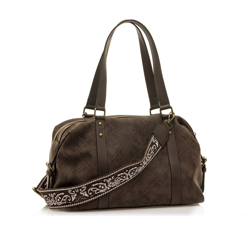 Bolso bowling de color moka para mujer, modelo Sanny de la marca MTNG. Este modelo destaca por su amplitud y funcionalidad, ideal para jornadas largas o escapadas. Incluye doble asa para llevar al hombro y una bandolera ancha ajustable con estampado