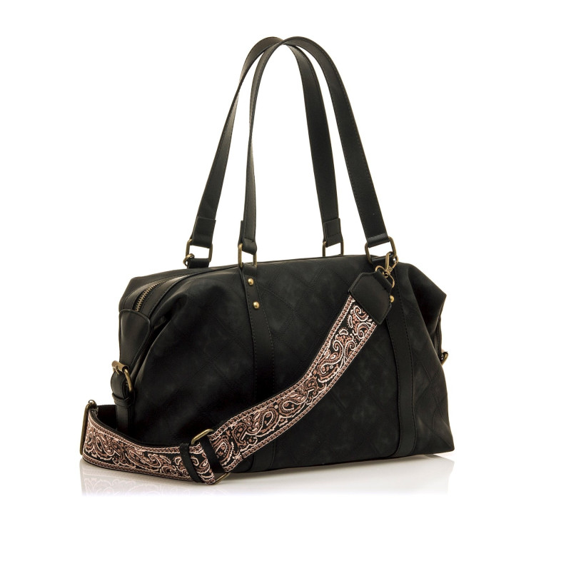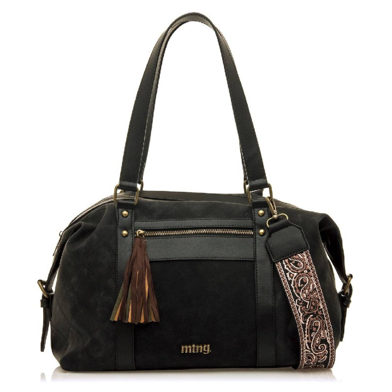 Bolso bowling negro para mujer de la marca MTNG, modelo Sanny. Este diseño es amplio y funcional, ideal para llevar todo lo que necesites sin renunciar al estilo. Incorpora doble asa de mano y bandolera ajustable con bordado paisley en tonos rosados,