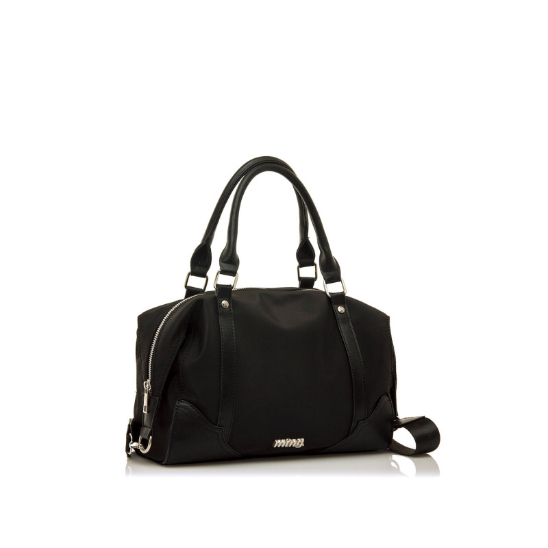 Bolso de color negro para mujer de mtng, modelo Sarai. Su diseño tipo bowling compacto incorpora doble asa de mano y bandolera ajustable, con detalles metálicos en plata que aportan un acabado moderno y funcional. El interior espacioso y el cierre co