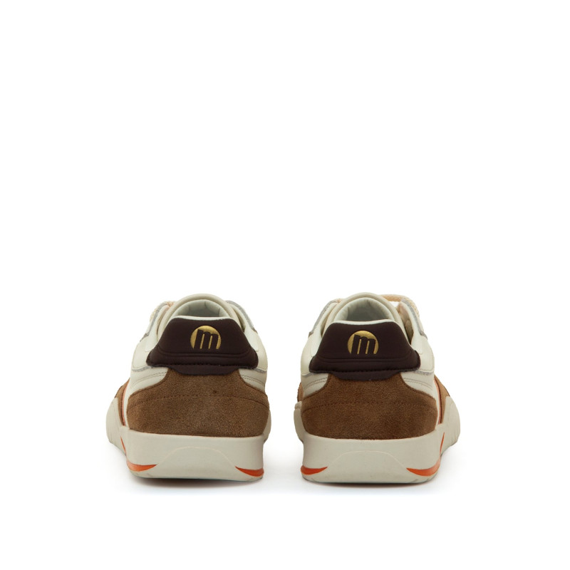 Zapatillas barefoot de piel de color crudo con detalles en marrón para hombre, modelo Free Orbit de la marca MTNG. El diseño combina paneles de diferentes texturas y tonos con refuerzos en zonas clave y detalles en naranja que le aportan un toque dep