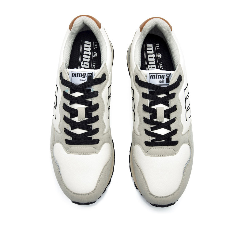 Zapatillas de hombre de la marca Mtng, modelo Joggo Classic de color blanco con detalles beige y marrón, diseño casual con inspiración deportiva. Esta zapatilla combina paneles con texturas suaves y el logotipo lateral en contraste negro para un toqu