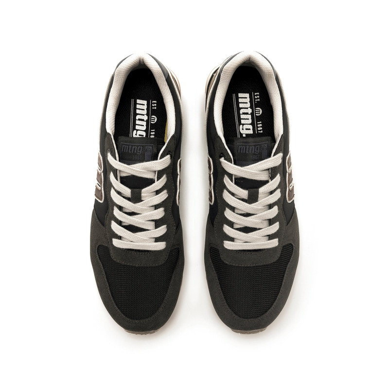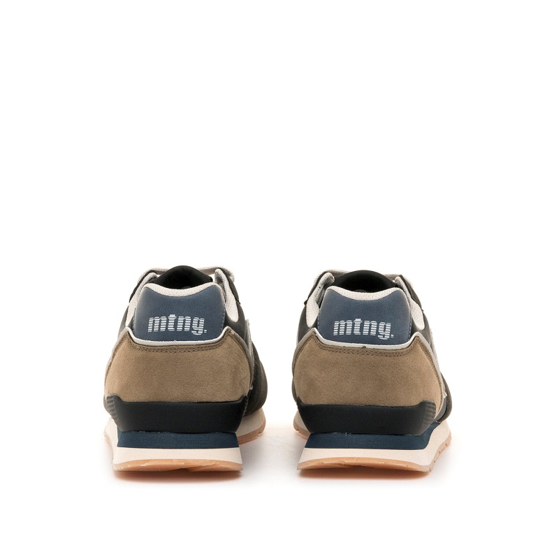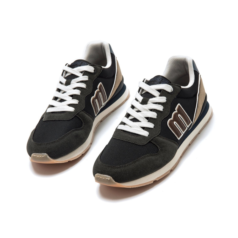 Zapatillas de color negro y beige para hombre de la marca mtng, modelo Joggo. Este diseño combina un estilo urbano con un aire deportivo. La parte superior mezcla diferentes texturas con detalles en contraste en caqui, el logo moka en el lateral y el
