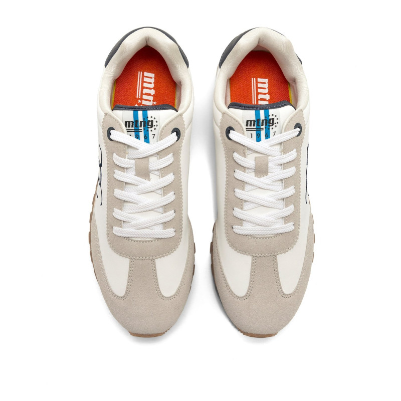 Zapatillas de color blanco para hombre de MTNG modelo Joggo Track, con estilo retro running y detalles en tonos beige, marino y naranja. Su diseño mezcla una base clara con contraste en la suela y bordes, aportando frescura sin perder el carácter dep