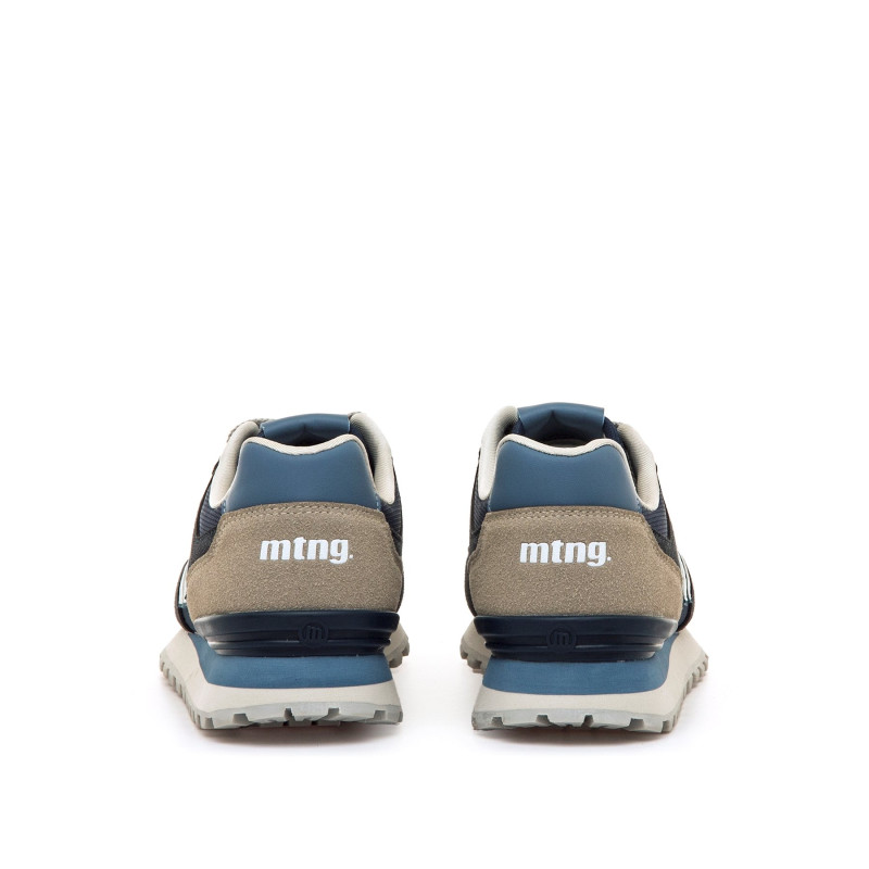 Zapatilla casual de color azul marino para hombre, modelo Joggo Track de Mtng, estilo retro urbano. El diseño mezcla paneles en diferentes tonos con detalles en contraste como el talón beige y el logo lateral blanco con borde azul claro. Incluye cord