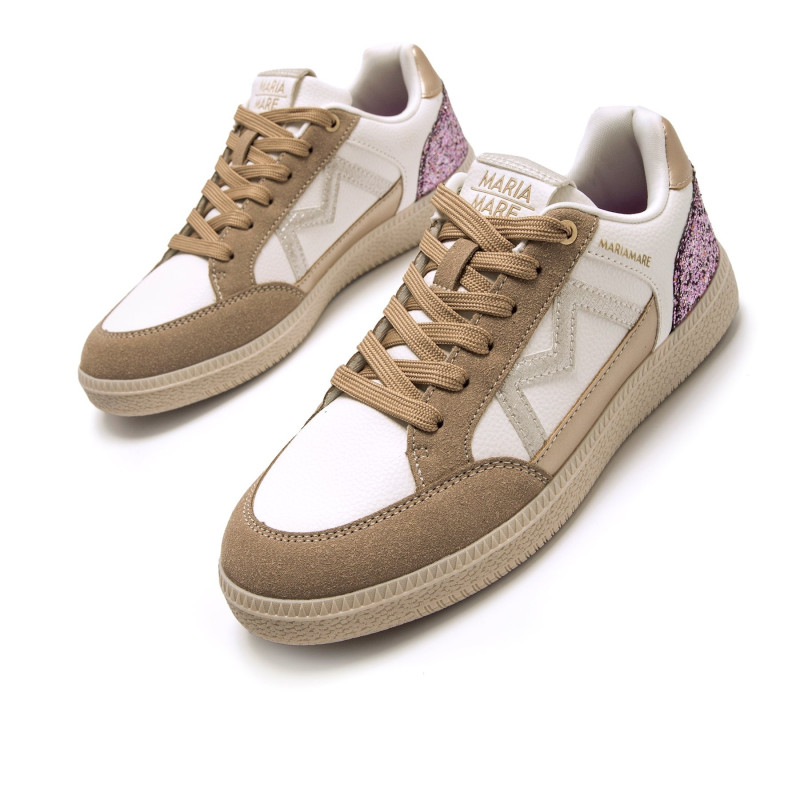 Zapatillas casual de color blanco y arena para mujer de Mariamare, modelo Fiora. Combina paneles en tonos neutros con detalles metalizados en tono champagne y una pieza trasera con acabado de glitter rosa que añade un toque llamativo. Destaca el logo