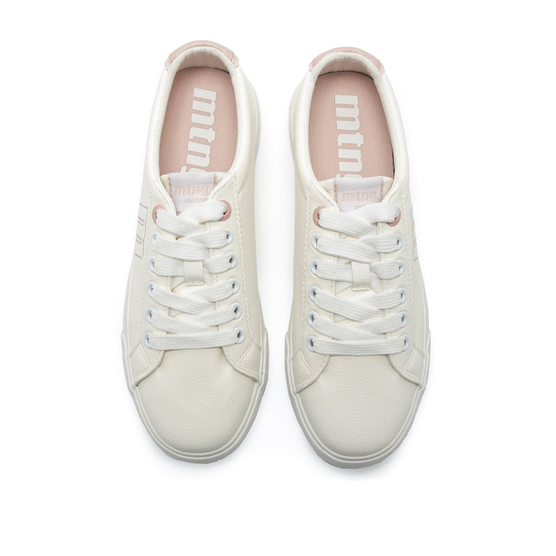 Zapatillas de color blanco para mujer de la marca Mtng, modelo Aria, de estilo casual y minimalista. Su diseño limpio incluye detalles en rosa claro en el talón, el logo lateral y los ojales, aportando un toque sutil de color. Con cierre de cordones