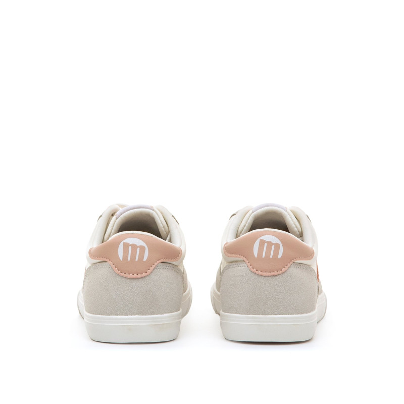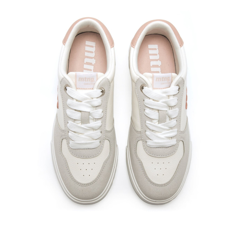 Zapatillas casual de color blanco para mujer, modelo Aria de la marca Mtng. Combinan base clara con detalles en gris y toques en rosa claro en el talón, lengüeta y logo lateral bordado, que aportan un contraste suave y femenino. El diseño de líneas l