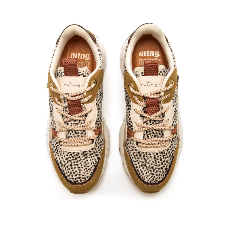 Zapatilla de color beige con estampado moteado para mujer de la marca mtng, modelo Climb de estilo trekking urbano. Diseñada con mezcla de paneles en tonos tierra y texturas variadas que aportan dinamismo al look. Destaca el talón metalizado en tono