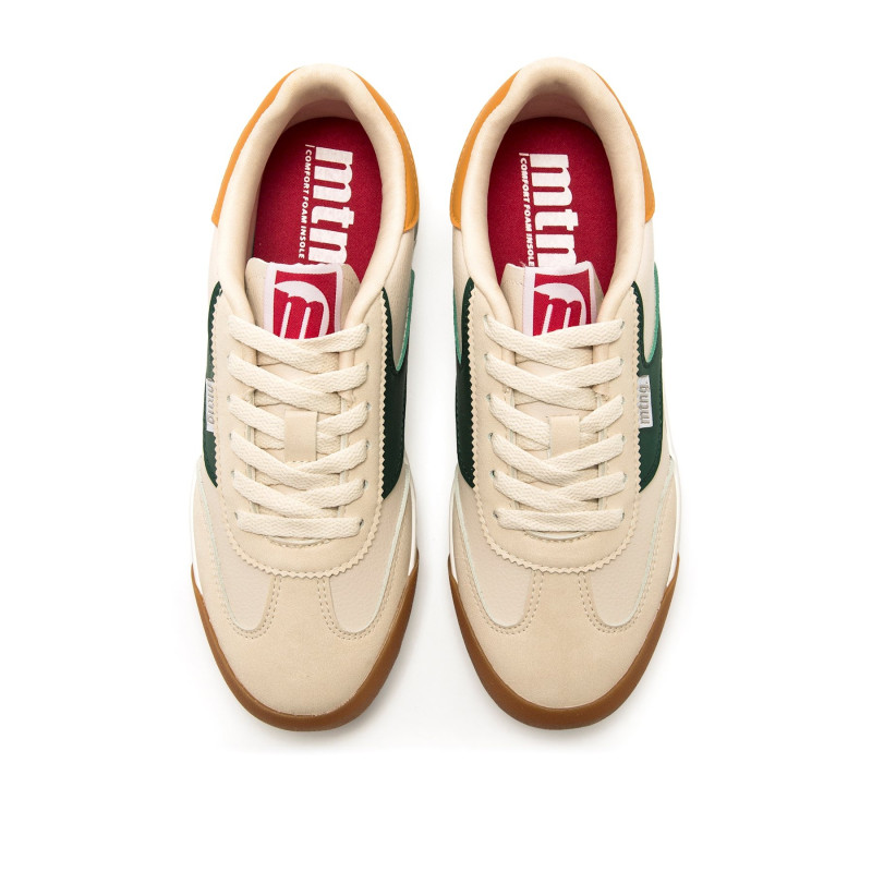 Zapatillas de color beige para mujer de Mtng, modelo Court de estilo retro. Un diseño inspirado en el calzado deportivo clásico, con detalles en verde y mostaza que le dan un toque vintage fácil de combinar. La suela de color caramelo y el talón con