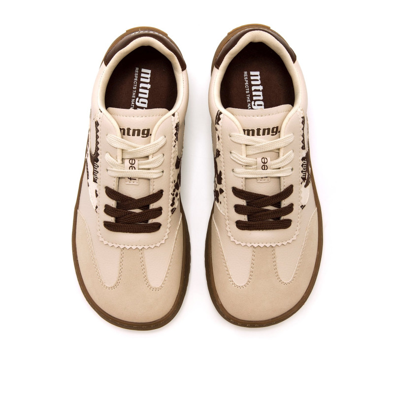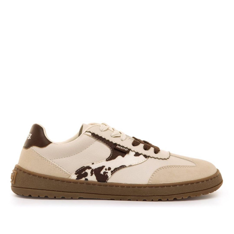 Zapatillas barefoot de color beige con estampado animal print de vaca para mujer, modelo Free Alask de Mtng. Su diseño destaca por la combinación de tonos neutros con detalles marrones que aportan contraste, y una lengüeta dentada que le da personali