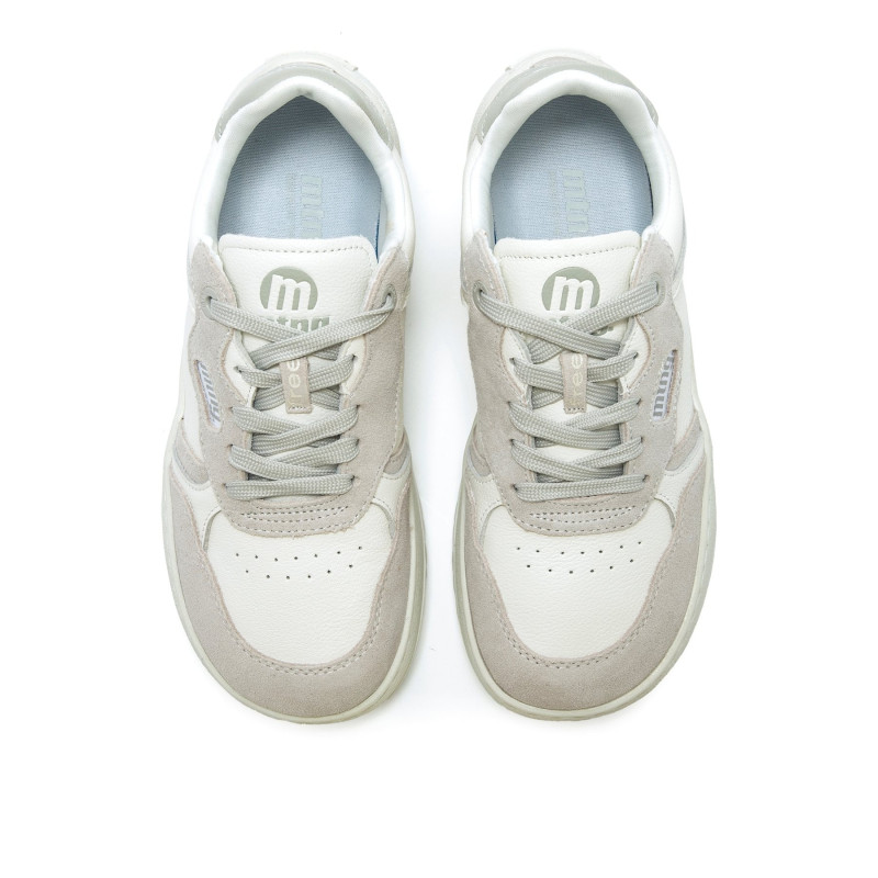 Zapatillas barefoot de color blanco roto y gris para mujer de la marca Mtng, modelo Free Alask. Fabricada en piel, combina paneles lisos con piezas de serraje que aportan textura y un look actual. Su suela plana y su cierre de cordones a tono asegura