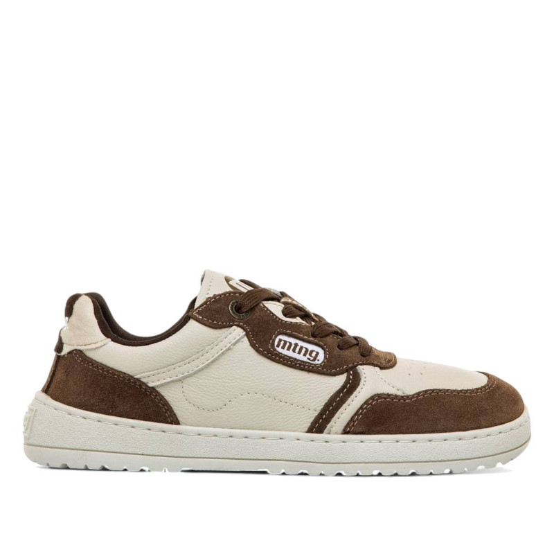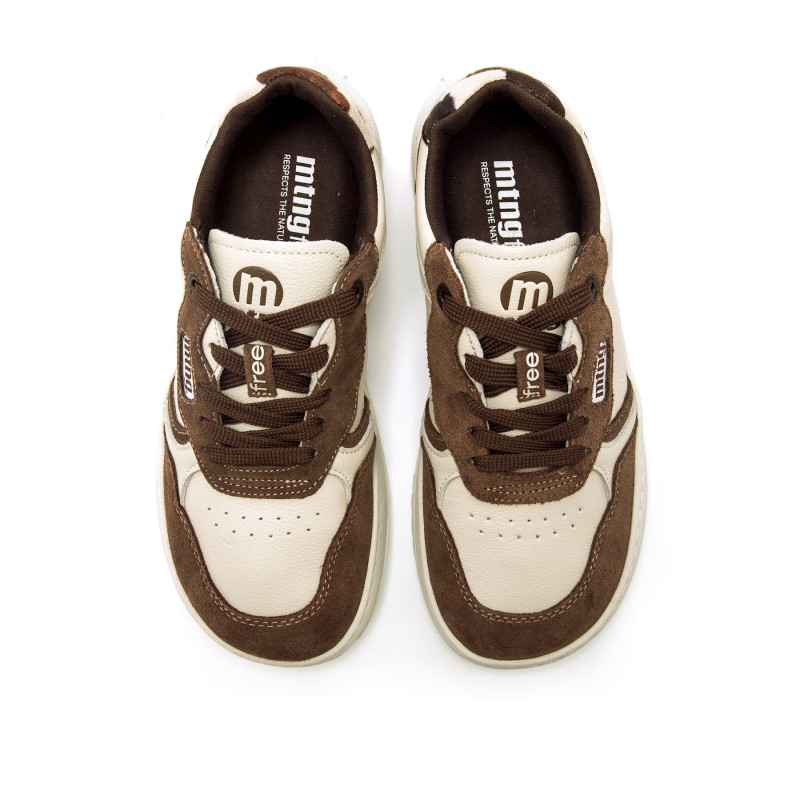 Zapatillas de color crudo y moka para mujer de la marca Mtng, modelo Free Alask fabricada en piel. Su diseño combina piezas de serraje con zonas lisas y detalle estampado animal print de vaca en el talón, aportando un contraste original. De perfil ba