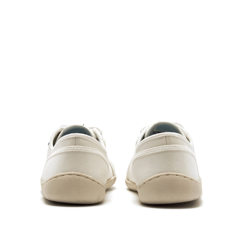 Zapatillas barefoot de color blanco para mujer de la marca Mtng, modelo Free Aria. Este diseño incorpora una puntera reforzada de color beige y suela a tono que aporta un contraste sutil. Su cierre de cordones con apliques metálicos asegura un ajuste