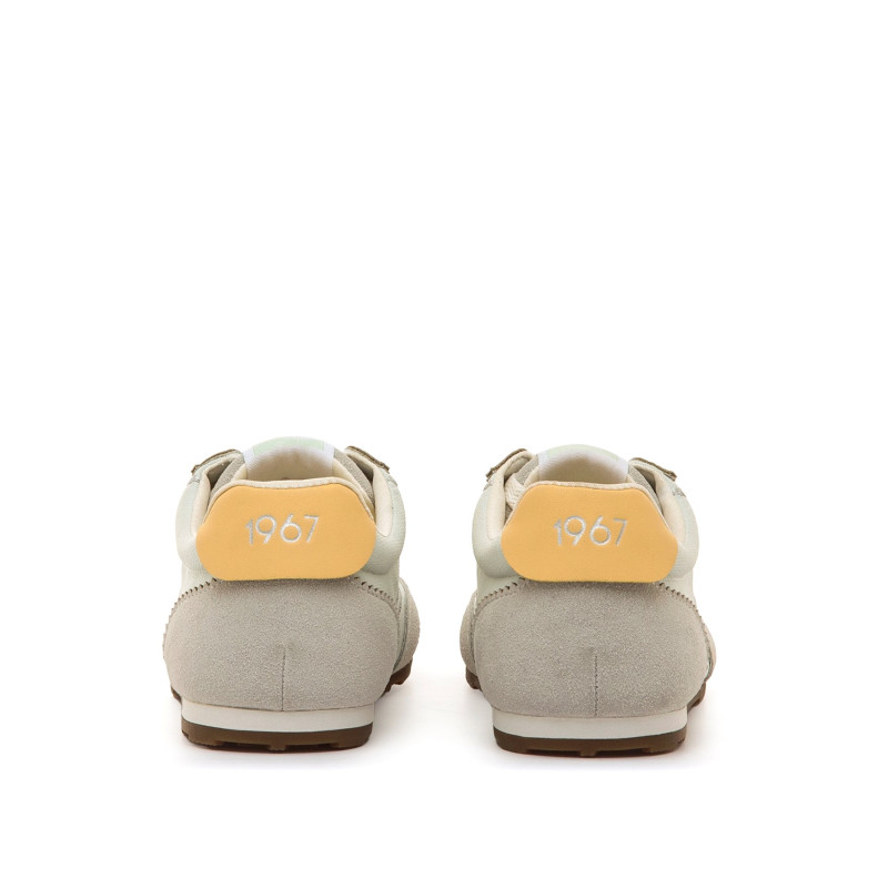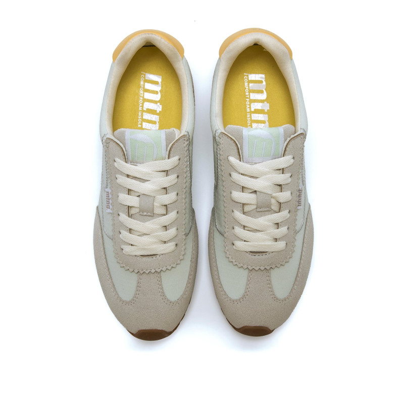 Zapatillas para mujer de la marca Mtng, modelo Janet de color verde claro y gris, de estilo retro. Su diseño combina paneles de distintas texturas y un distintivo detalle amarillo en el talón que le da un aire vintage. Con cierre de cordones y suela