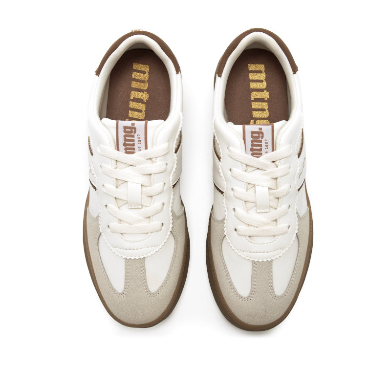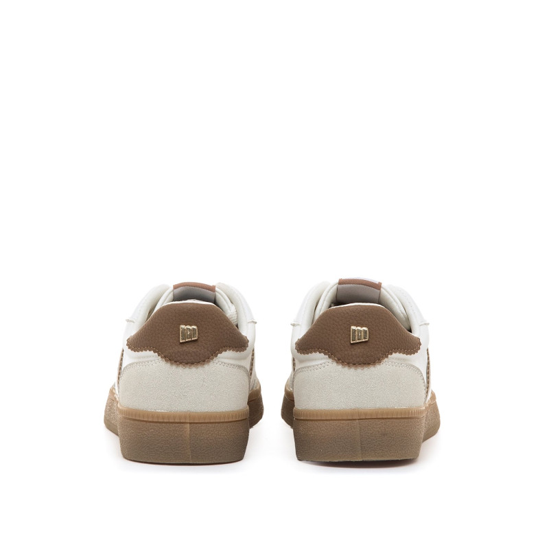Zapatillas de color blanco con detalles beige y marrones para mujer, modelo Roy de Mtng. Su diseño combina una base clara con contraste en el talón y bandas laterales, aportando un aire retro muy versátil. La suela de goma en color caramelo ofrece un