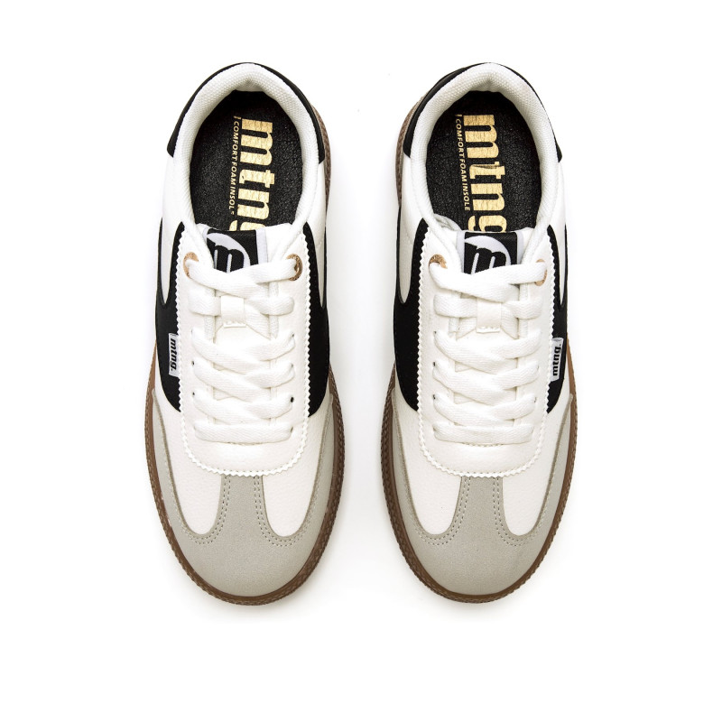 Zapatillas casual para mujer de la marca Mtng, modelo Saoko de color blanco con detalles en negro y gris. Presenta un diseño clásico con contraste lateral y puntera en tono gris claro tipo ante, que le da un toque actual y fácil de combinar. La suela