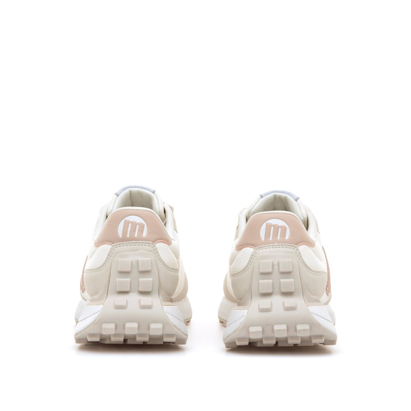 Zapatillas de estilo casual deportivo para mujer de la marca Mtng, modelo Zinc de color blanco y gris con detalles en rosa. Este diseño combina una base neutra con toques suaves de color en el logo lateral y el talón, aportando un aire moderno y fres