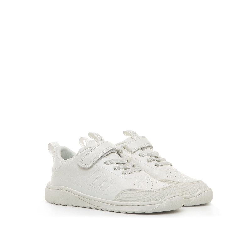 Zapatillas barefoot de color blanco para niños de la marca Mtng, modelo Free. Incorpora un sistema de cierre con cordones y tira adhesiva. Su diseño lavable combina una base lisa con perforaciones en el empeine para mayor transpirabilidad, tiradores