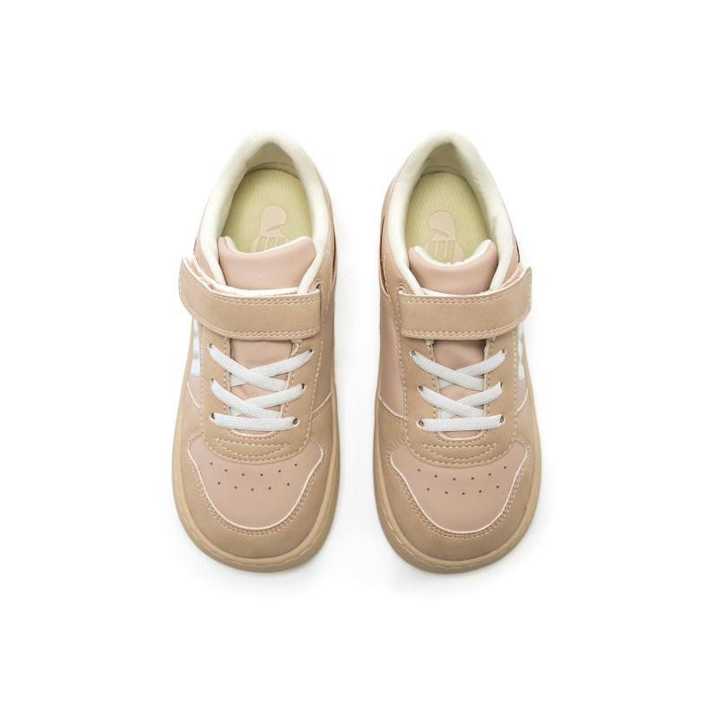Zapatillas barefoot de color rosa claro para niña de la marca Mtng, modelo Free de estilo deportivo. El diseño combina tonos pastel con detalles en aguamarina en el lateral y el talón, sobre una suela beige que aporta armonía y funcionalidad. El cier