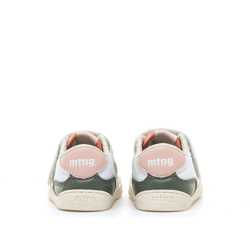 Zapatillas barefoot para bebé de la marca mtng, modelo Free Baby de color blanco con detalles en verde. Destaca por su diseño en tonos aguamarina y rosa claro, combinado con el logo coral en la tira adhesiva que aporta un toque moderno. Diseñada y de