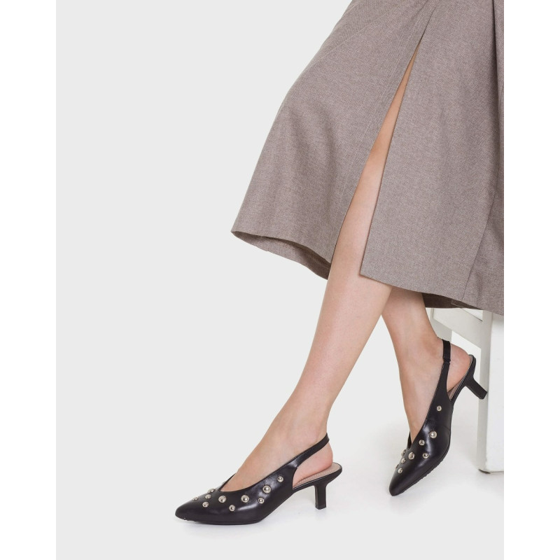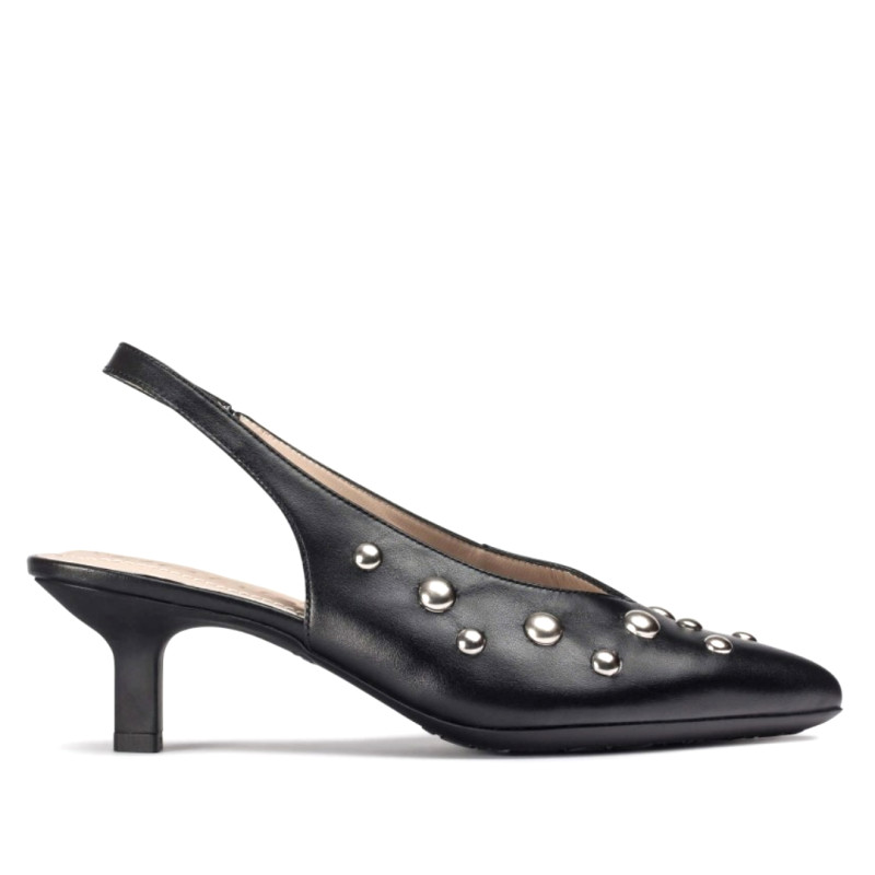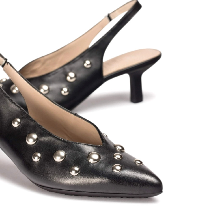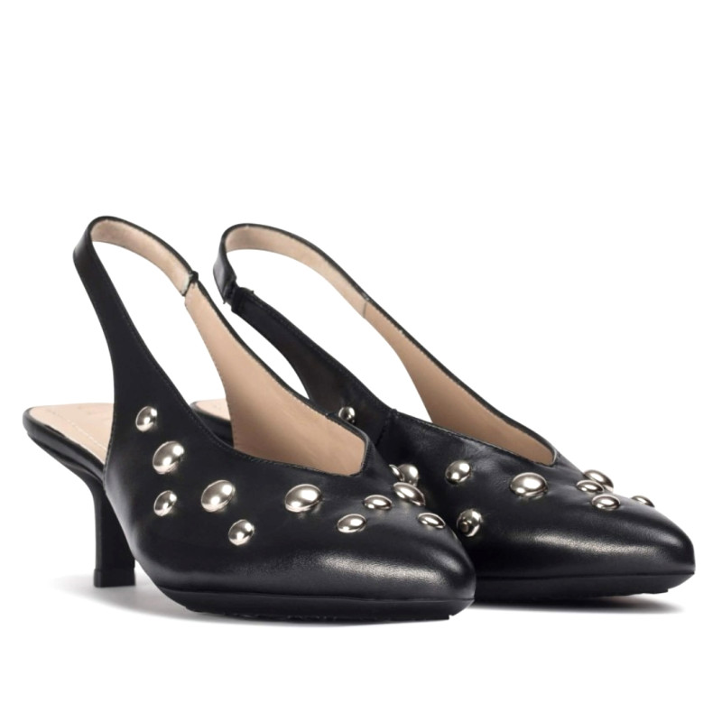 Zapatos destalonados FLEXFIT 23 confeccionados en piel lisa negra, decorado con tachuelas metálicas en distintas dimensiones. El escote en V estiliza el empeine, mientras que el tirador trasero con elástico garantiza una sujeción cómoda y segura. El tacón