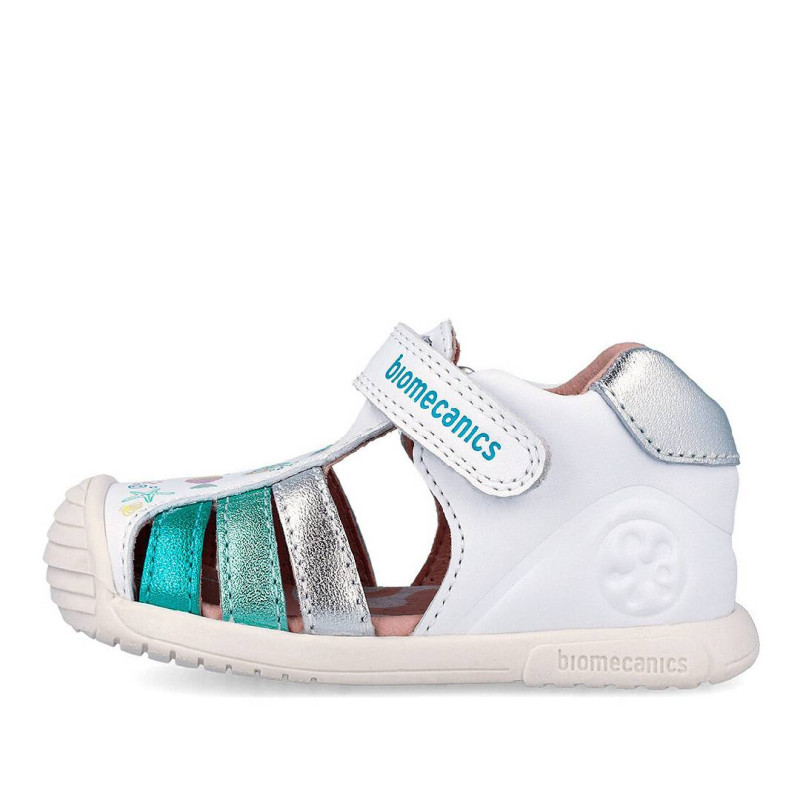 Estas sandalias para niña Biomecanics modelo 262109 combinan estilo, comodidad y funcionalidad. En color blanco con detalles azules metalizados y divertidos dibujos de pececitos, están especialmente diseñadas para gatear y dar los primeros pasos. Fabricadas en piel de alta calidad, proporcionan suavidad, ajuste seguro y comodidad para los pies en crecimiento, cuidando la correcta posición y movimiento natural del pie.