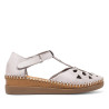 Sandalias con cuña baja para mujer de la marca 48h en color blanco. Presentan un delicado diseño troquelado que aporta un toque femenino y fresco, además de un cómodo cierre de velcro y costuras vistas que realzan su estilo artesanal. Fabricadas en piel, ofrecen suavidad, transpirabilidad y un ajuste perfecto para el uso diario. Ideal para quienes buscan confort y elegancia en un solo calzado.