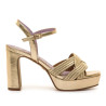 Sandalia de tacón de color gris metalizado para mujer, modelo Roseta de Mariamare. Diseñada con tiras delanteras cruzadas y plataforma delantera que compensa la altura del tacón ancho, aporta estabilidad y estiliza la figura. Incorpora pulsera al tob
