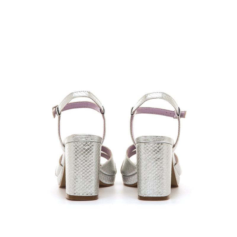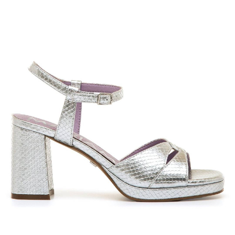 Sandalias de tacón plateadas de la marca Mariamare, modelo Cefalu para mujer de estilo fiesta con acabado metalizado. Este diseño con acabado texturizado incorpora tiras cruzadas en la parte delantera y cierre con hebilla al tobillo que aporta sujeci
