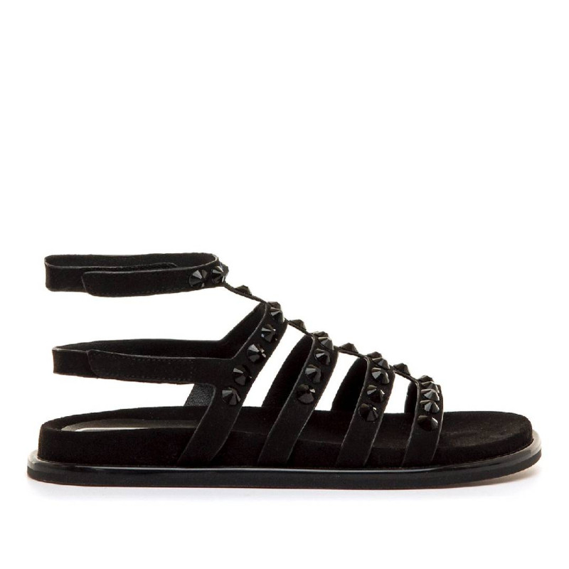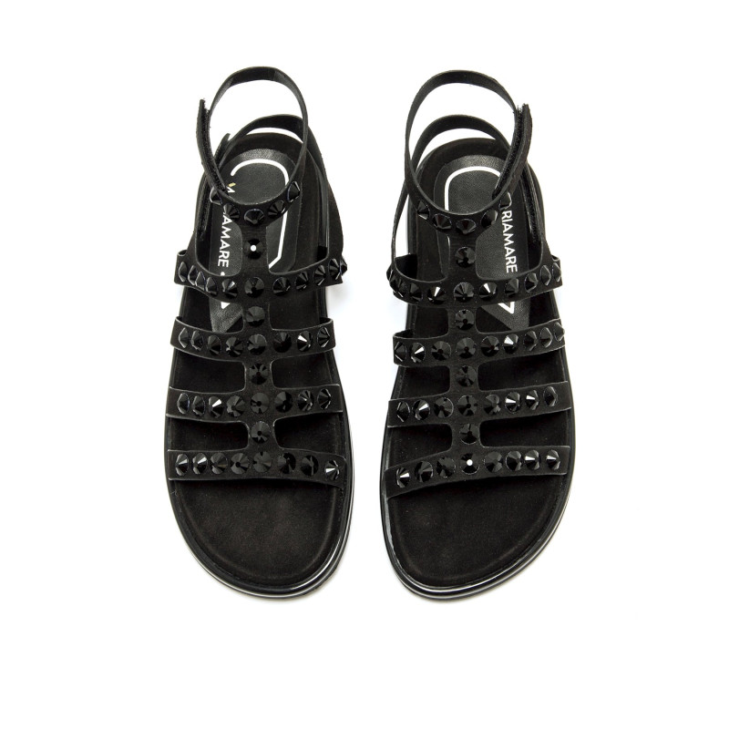 Sandalias planas negras para mujer de la marca Mariamare, modelo Faella de estilo romano con diseño de múltiples tiras que aportan sujeción. Incorporan cierre adherente al tobillo que facilita el ajuste y detalle de tachas decorativas en las tiras af