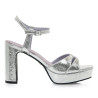Sandalia de tacón plateada Roseta de Mtng para mujer, diseñada con una tira frontal cruzada que añade un toque moderno y atractivo. Cuenta con una plataforma que aporta mayor altura mientras que el cierre ajustable con hebilla en el tobillo asegura u