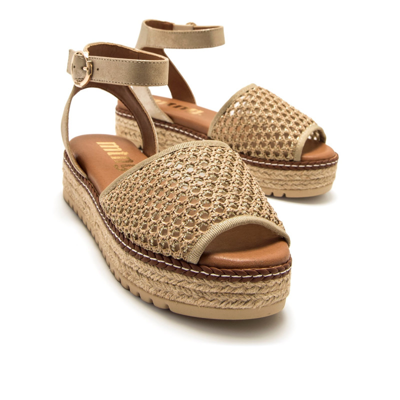 Sandalia de plataforma de color dorado para mujer de la marca Mtng, modelo Amelie. Destaca por su diseño fresco con pala tejida de estilo rejilla, ideal para los días de calor. El cierre con pulsera al tobillo y hebilla metálica ofrece un ajuste cómo