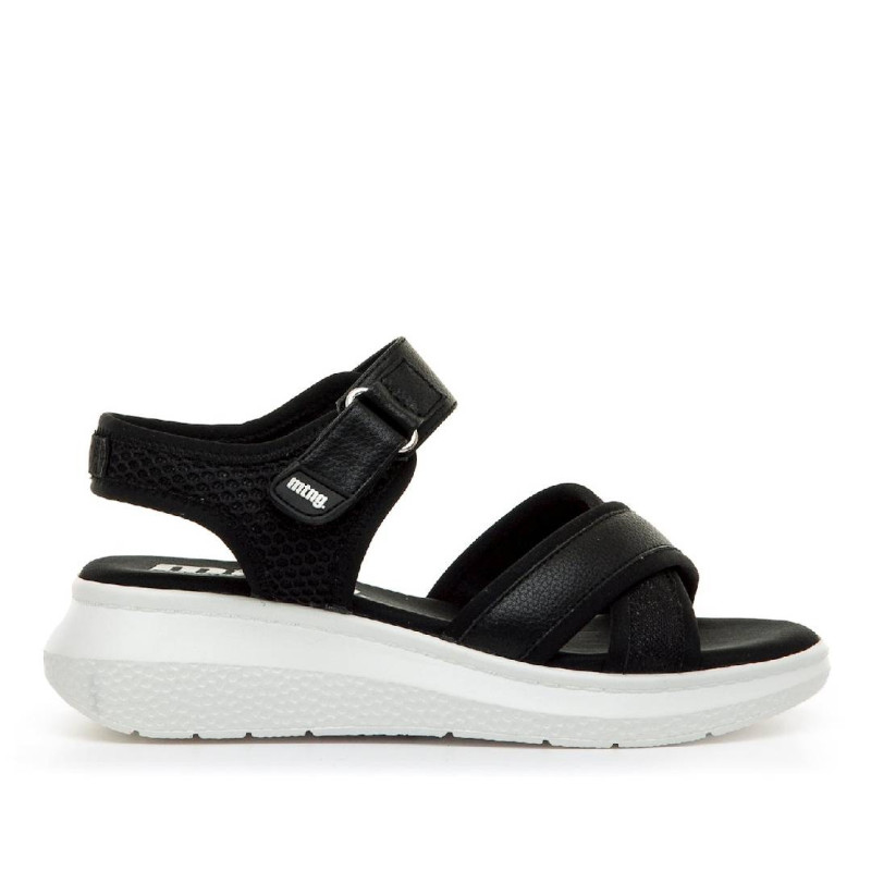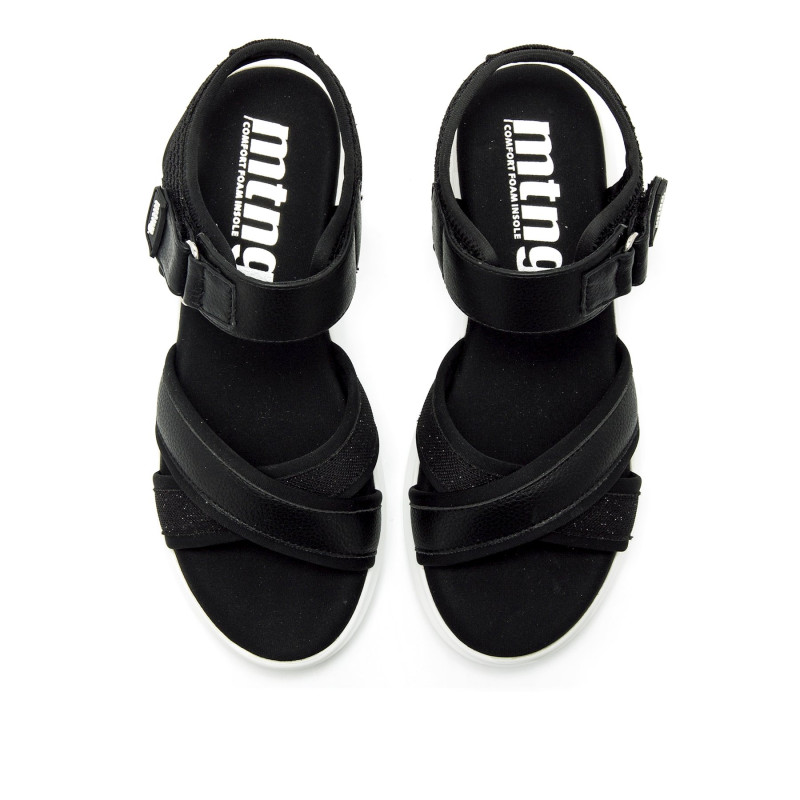 Sandalia de color negro para mujer, modelo Cotton de Mtng con plataforma. Este diseño combina tiras cruzadas de acabado liso en la parte delantera que aportan sujeción y un look actual. Incorpora cierre ajustable en el tobillo con tira adherente que