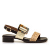 Sandalias de piel para mujer de la marca Mtng, modelo Ines de color moka y dorado. Este diseño de tacón bajo combina pala delantera tipo rafia trenzada con tira ancha de acabado metalizado champagne y hebilla decorativa de efecto carey. Incorpora cie