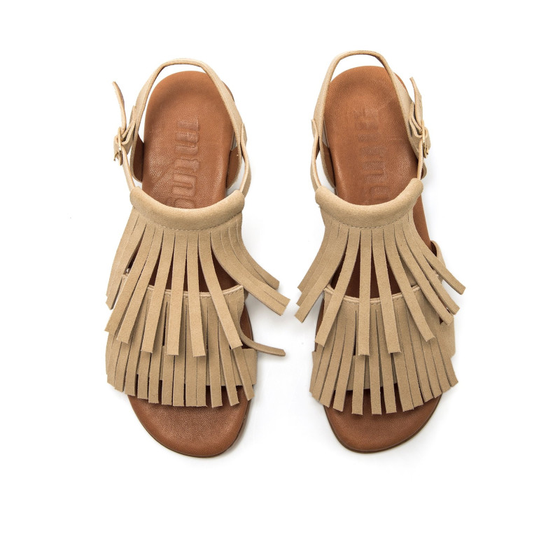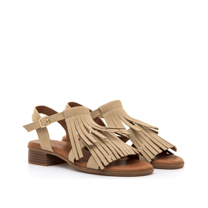 Sandalia de tacón bajo de color camel para mujer, modelo Ines de la marca Mtng. Diseñada en piel, incorpora tiras anchas en la pala y detalle de flecos en la parte frontal que aportan movimiento y un aire boho. El cierre de pulsera al tobillo con heb