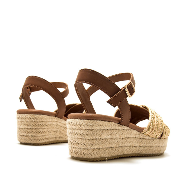 Sandalia de cuña para mujer de Mtng, modelo Lita en tonos vainilla y marrón. Su diseño con plataforma de acabado tipo yute aporta un aire fresco y natural ideal para los días cálidos. Su pala de tiras cruzadas trenzadas de color natural con detalles