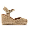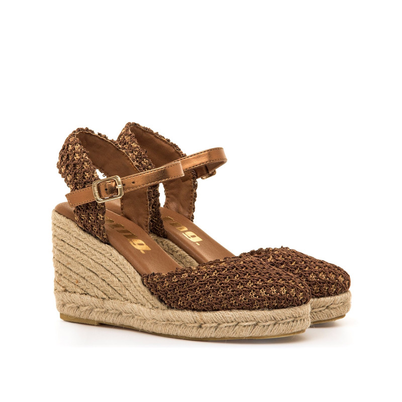 Cuñas de color marrón para mujer de la marca Mtng, modelo Louisa de estilo veraniego. Su diseño combina una pala cerrada de tejido calado y talonera a juego, con una pulsera ajustable de color cuero para mayor sujeción. La plataforma forrada en yute