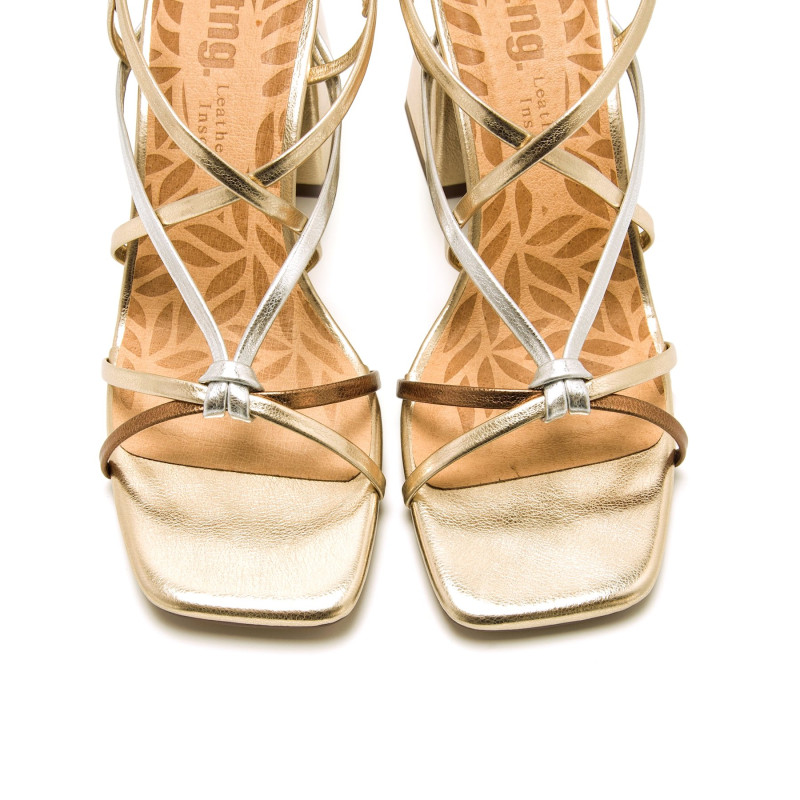 Sandalias de tacón doradas Karla de Mntg, para mujer. Estas sandalias destacan por su acabado brillante y combinación de tonos metalizados dorado, plateado y bronce en las tiras finas cruzadas con las que cuenta. Tiene un cierre de hebilla y un tacón