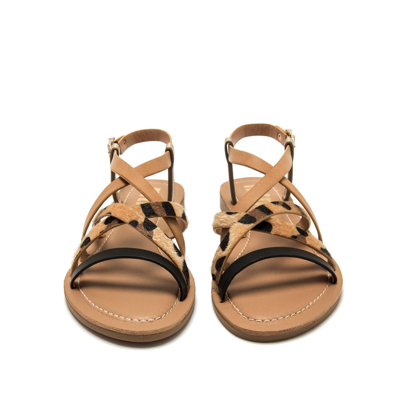 Sandalias planas para mujer de Mtng, modelo Tatiana de color marrón, con detalles en negro y dorado. Diseñada con tiras finas combinadas, incluye una tira frontal de color negro y otras cruzadas con estampado animal que aportan un toque original. El