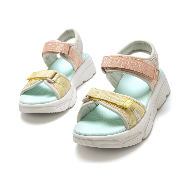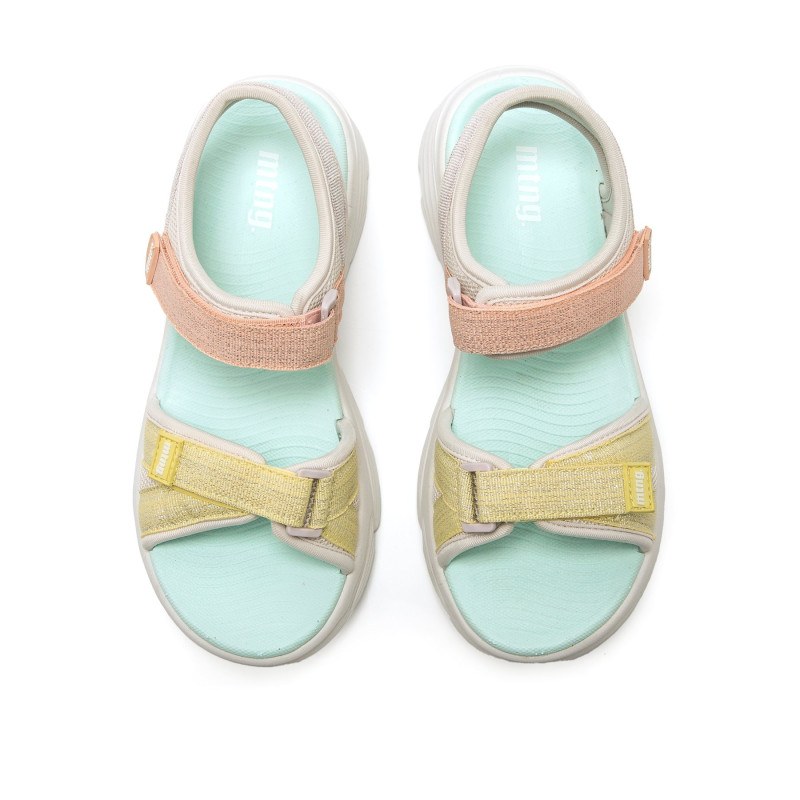 Sandalias deportivas multicolor para mujer, modelo Tsunami de la marca Mtng, de estilo casual. Diseñadas con tiras ajustables adhesivas en empeine y tobillo, destaca por su acabado brillante en tono melocotón, gris y amarillo, que le aporta un toque
