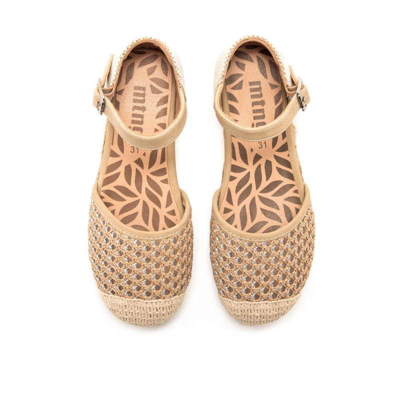 Alpargatas de color beige para niña de la marca Mtng, modelo Pad con un diseño cómodo y ligero ideal para el verano. La pala cerrada presenta un acabado calado, mientras que la puntera trenzada y la talonera en tejido tipo malla refuerzan su estilo a