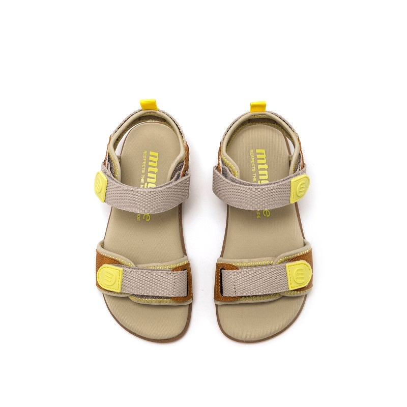 Sandalias barefoot de color marrón y taupe para niño, modelo Free de la marca Mtng. Combina tiras ajustables con cierre adherente sobre el empeine y el tobillo. Cuenta con distintas texturas y detalles en amarillo que aportan un toque original. Diseñ
