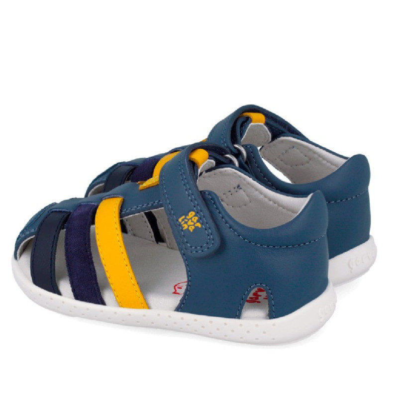 Las sandalias para niño Garvalín modelo 262325 en color azul con detalles amarillos combinan diseño funcional y comodidad en un estilo cangrejera ideal para los más pequeños. Fabricadas en piel de alta calidad, ofrecen suavidad, resistencia y una buena transpirabilidad. Su diseño barefoot favorece una pisada natural, respetando el desarrollo del pie infantil y proporcionando mayor libertad de movimiento. Incorporan cierre con velcro, que permite un ajuste rápido, cómodo y seguro, facilitando su uso diario. Un modelo perfecto para acompañar a los niños en sus actividades de verano con confort y protección.