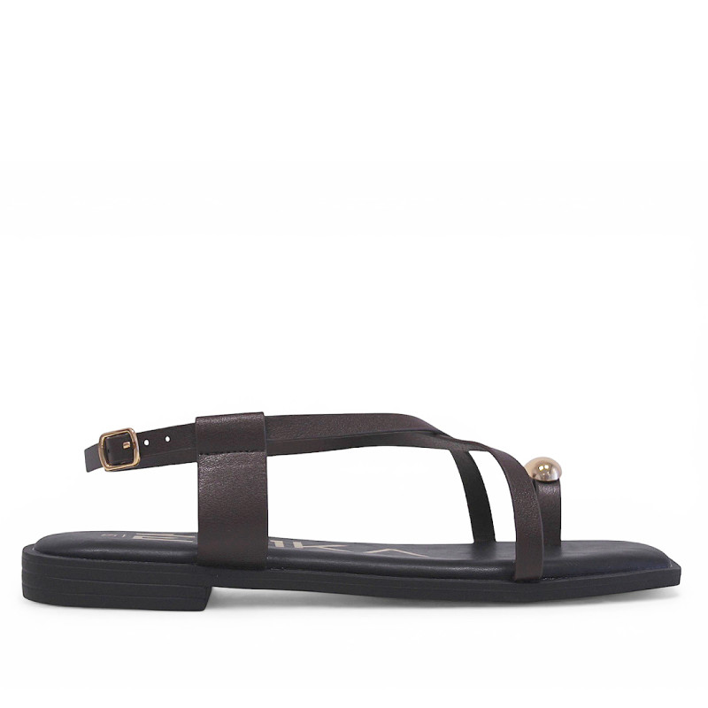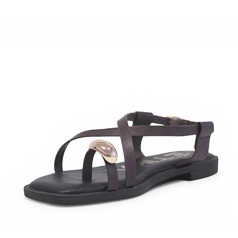 Sandalias planas Querol marrones con tiras cruzadas y anillo dorado al dedo